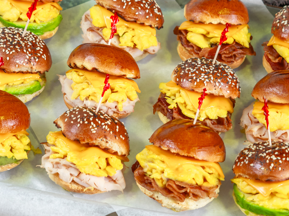 Our breakfast sandwich selection is crafted to satisfy every palate, making them perfect for office breakfasts, team meetings, and events. Choose from hearty breakfast burritos with scrambled eggs, cheese, and fresh veggies, Brooklyn bagel egg sandwiches topped with premium proteins, or flaky croissant egg sandwiches loaded with melted cheese and savory options like bacon, ham, and turkey. For lighter bites, our mini egg sandwiches offer the same delicious flavors in smaller portions—ideal for sharing. With flexible serving sizes for both small and large groups, we ensure everyone gets a delicious start to the day.